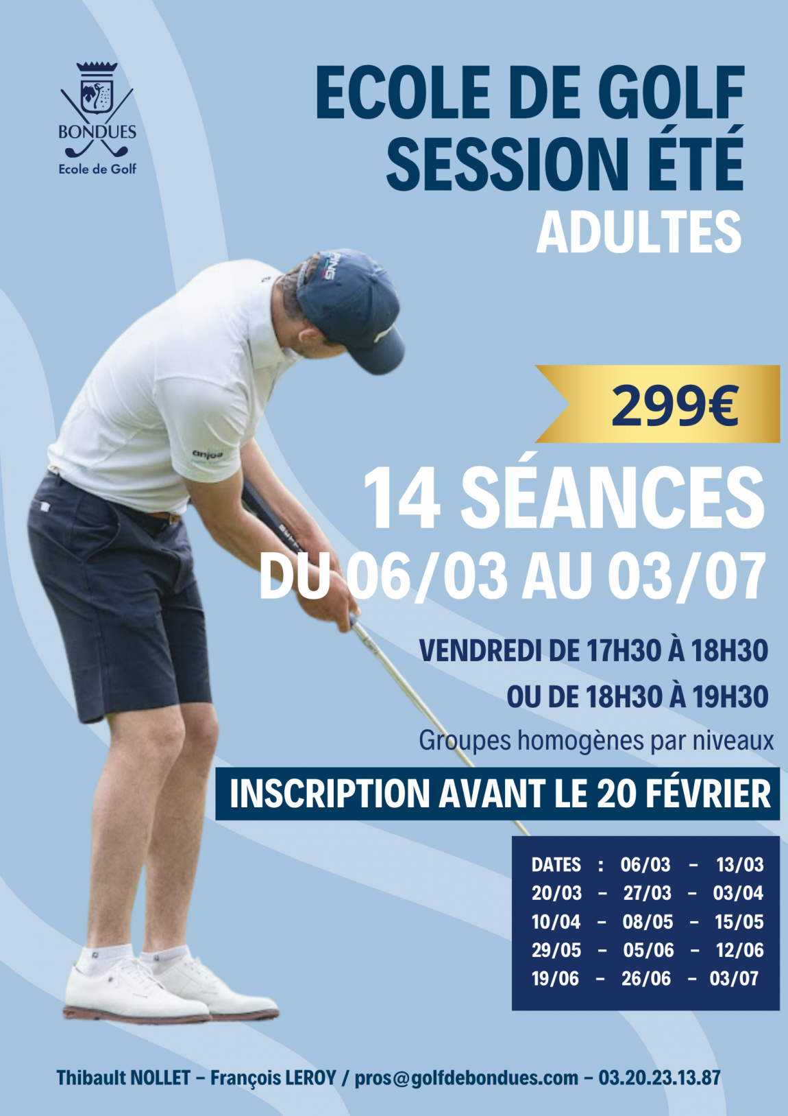 Le Golf de Bondues propose une session estivale dédiée aux adultes, idéale pour progresser, se perfectionner ou découvrir le golf dans un cadre convivial et structuré.