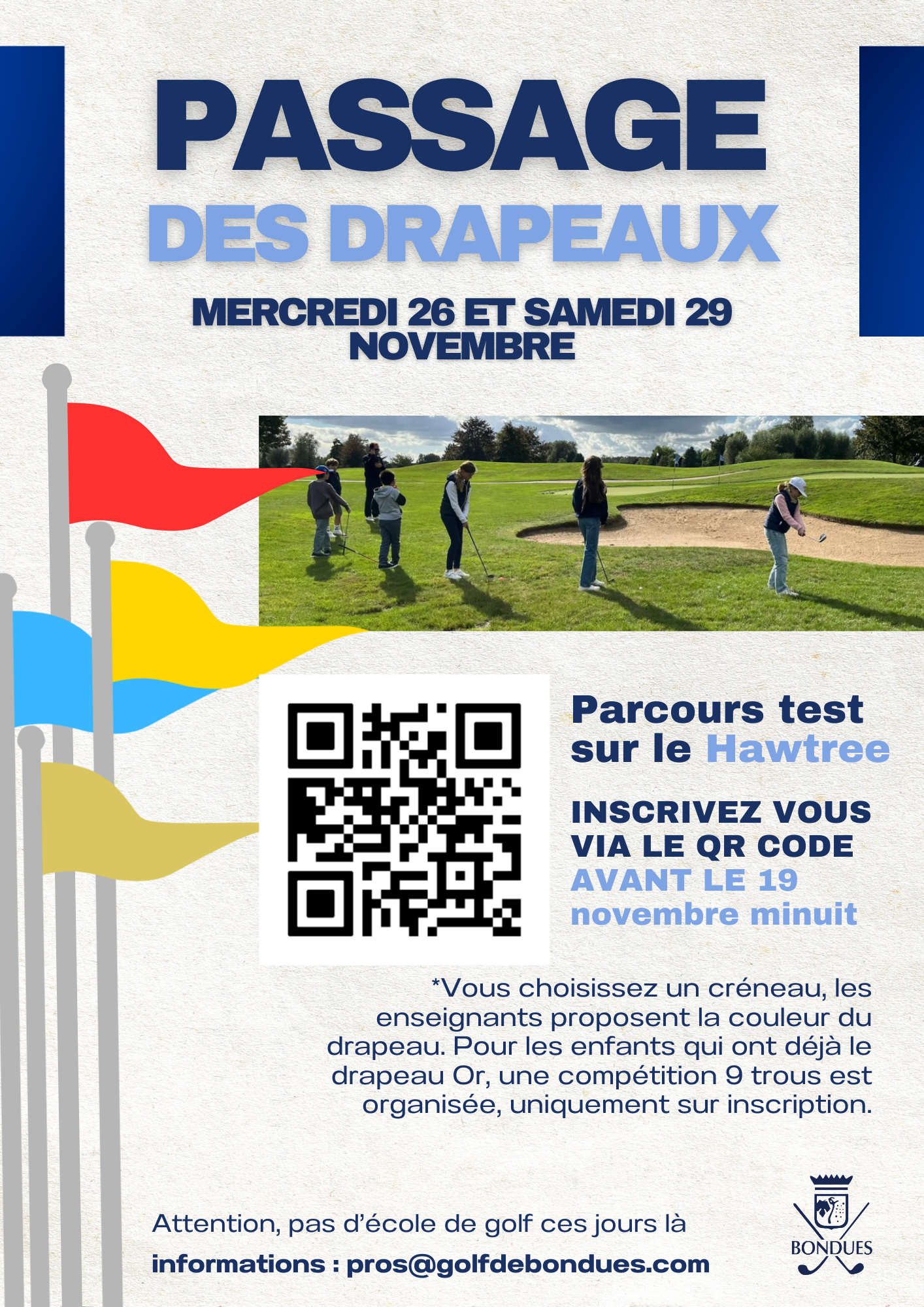 Notez bien l'adresse mail de notre équipe enseignante pros@golfdebondues.com, qui se tient à votre disposition pour répondre à vos différentes questions.